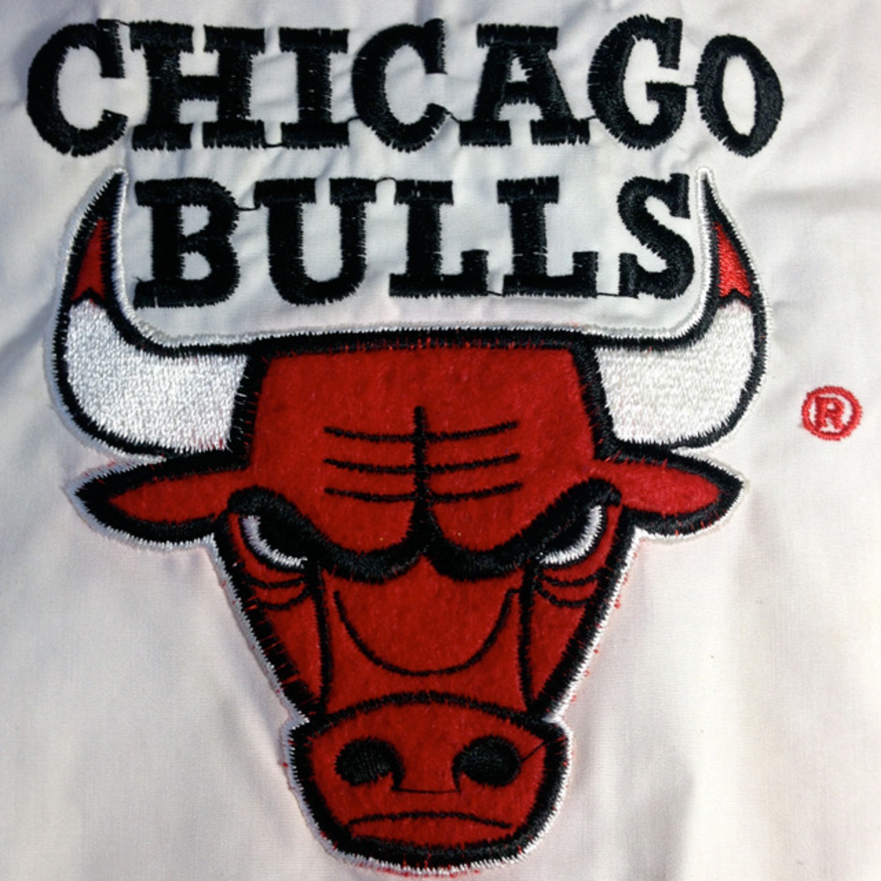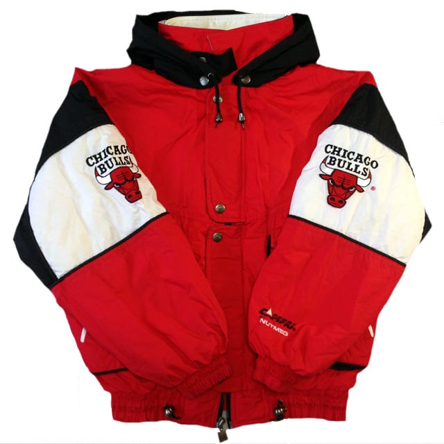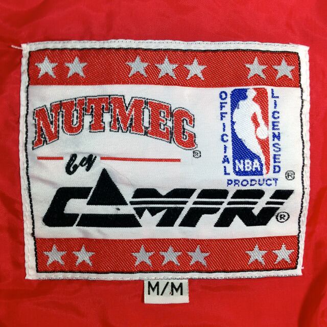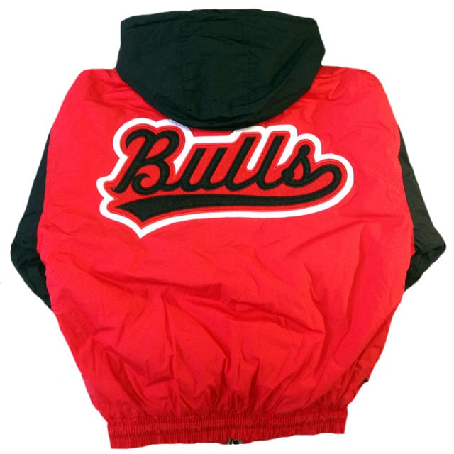 両スリーブには定番のチームロゴ、バックにはBullsの文字と色合いがインパクトのあるスタジアムジャケットとなります。